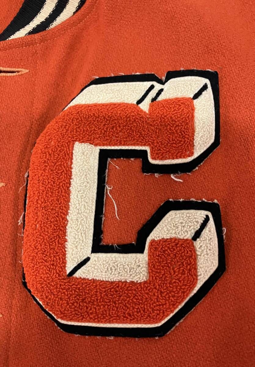 Champion チャンピオン 50 s ランタグ ボタスタ スタジャン 袖ほつれ有 首元汚れ有 サイズL オレンジ
