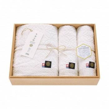 平安時代の女流歌人、小野小町が美しかったことから美しい女性の呼び名として使われる小町。今治で評判の美しい娘をイメージし、伝統の織技術を駆使して一つ一つ織り上げていく。そんなシリーズが今治小町です。 お慶びの七宝柄を毛中のジャガードで表現、光沢の糸で紗綾形模様を地づり紋織でヘムを際立たせた高級感あふれる演出のタオルギフト。