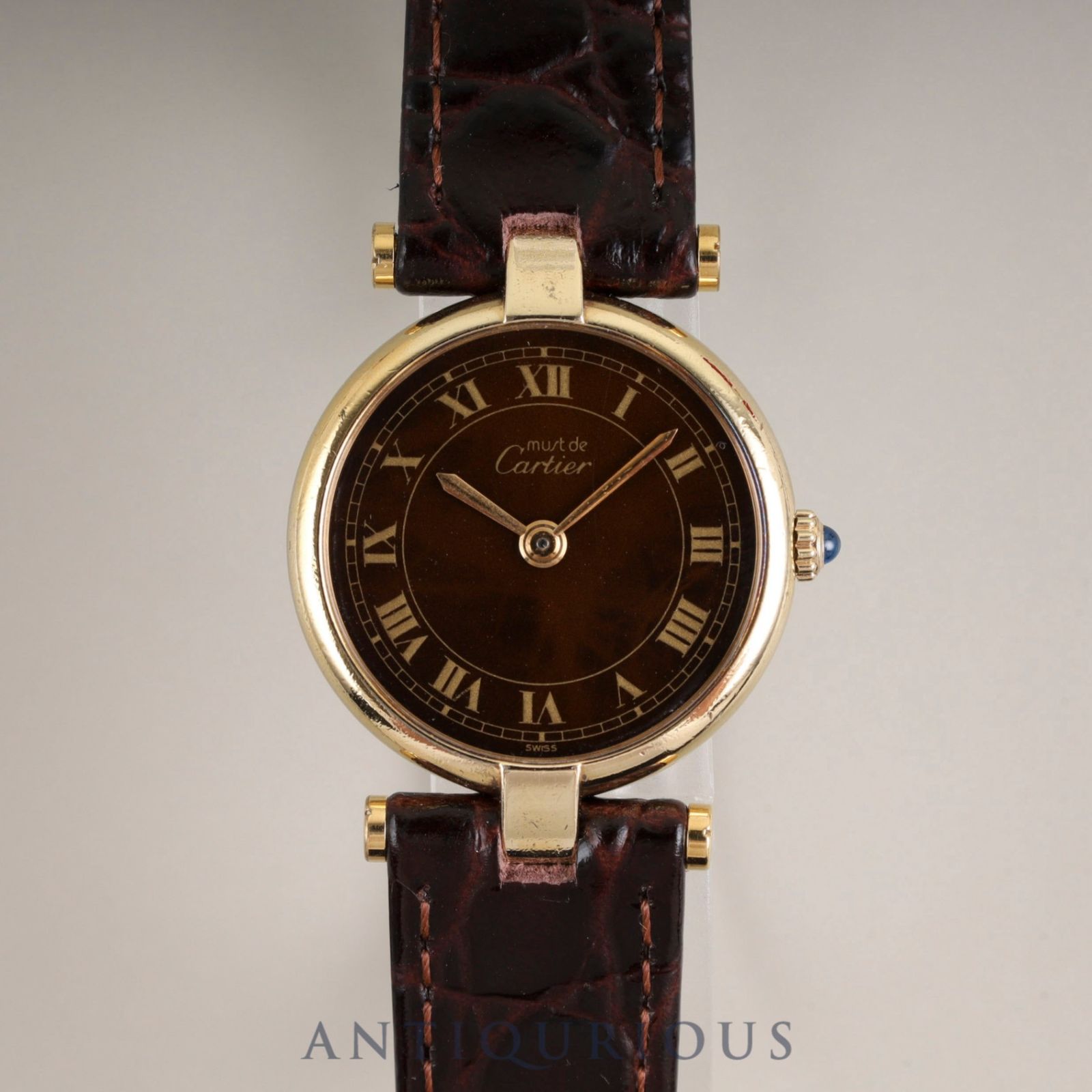 カルティエ マスト ヴァンドーム VLC SM 18 クォーツ Cal.81 SV 925 革 尾錠 GP マホガニーローマン文字盤 箱 オーバーホール済み