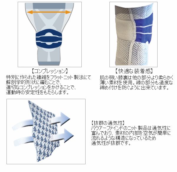 膝関節周辺部の痛みや不安定感に全般的に使用できる膝サポーター。膝関節の形状に沿って編まれたニット編みとシリコーンパッドが膝関節を安定化させるとともにマッサージ効果を促します。