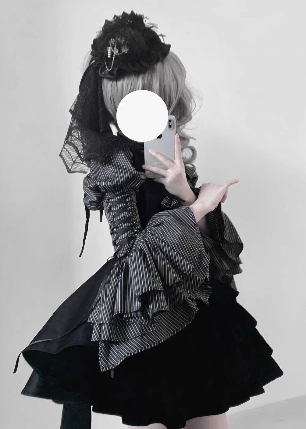 黒ロリ ダーク系 ブラウス ベスト スカート セット ゴシック ロリータ フリル コルセット ティアード ブラック ストライプ ボリュームスリーブ リボン 編み上げ ウエストマーク 細見え 美シルエット 地雷系 量産型 原宿系 レディース コスプレ