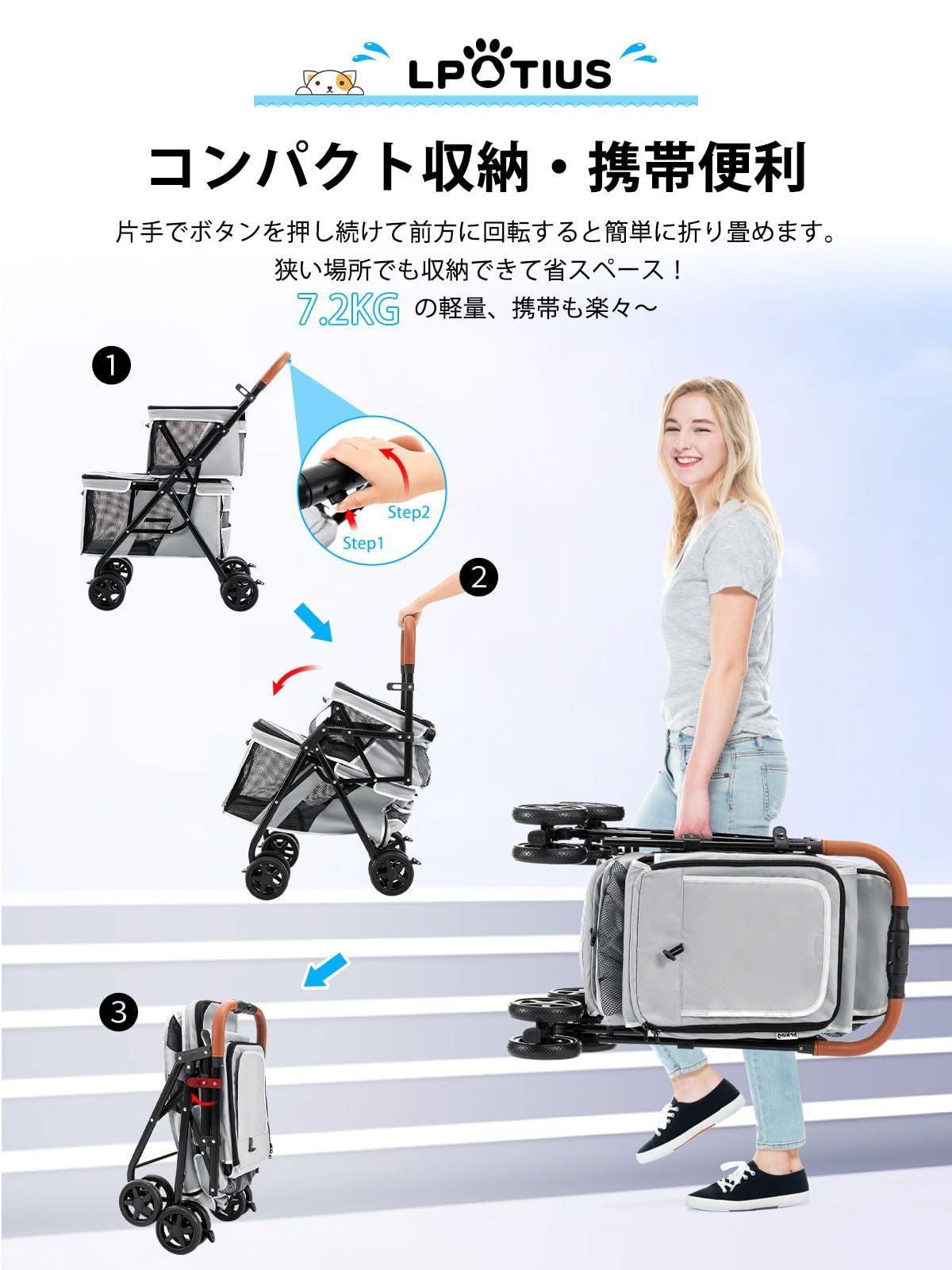 LPOTIUS ペットカート 多頭 上下2段式 ペットバギー ワンタッチ 折りたたみ 犬用ベビーカー コンパクト 収納便利 4輪 前輪360°回転 後輪ブレーキ付き 軽量 犬用カート 小型犬 中型犬 犬猫兼用 耐荷重20KG 上段8KG 下段12KG 多頭飼い対応 お出かけ 散歩 通院 介護用 ドッグカート 組み立て簡単(グレー)