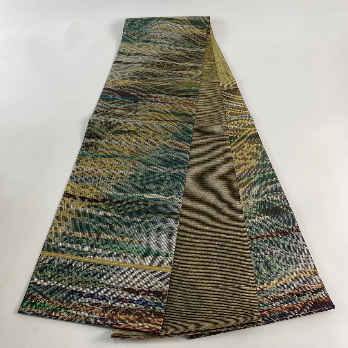 袋帯 秀品 波頭 霞 金糸 箔 緑 お太鼓柄 正絹