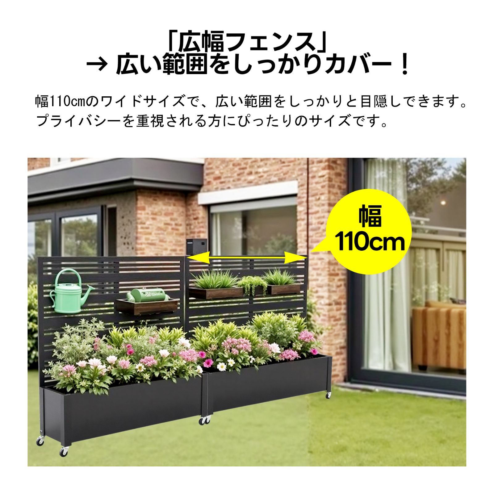 フェンス プランター付き 目隠し キャスター付き 花壇フェンス 簡単設置 電着塗装 幅110×高さ110 cm ガーデニング 花立て 屋外 室内 園芸用品 耐久性 スチール プランター ガーデンラティス プランターボックス 庭園 おしゃれ ブラック