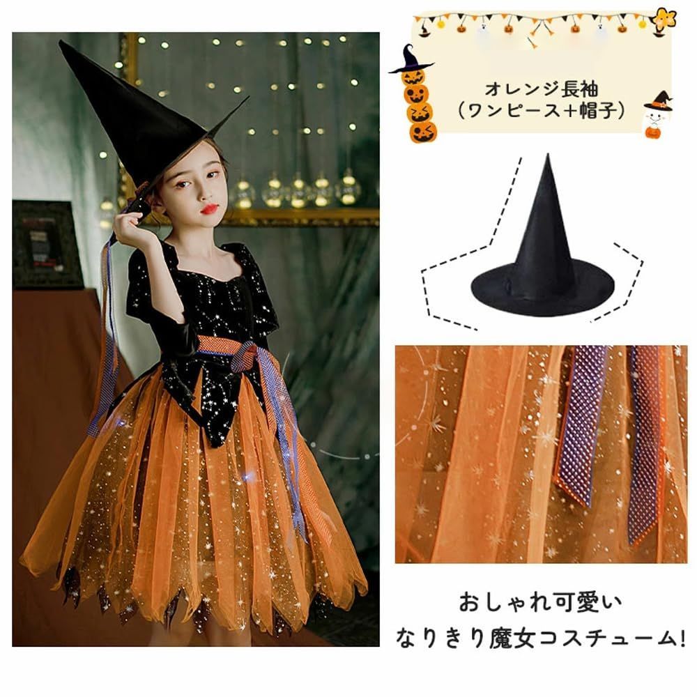 ハロウィンの明るい雰囲気に合わせたオレンジ基調色に、夜空の星を思わせる星柄をプリントし、リボンでウエストや袖口をアクセント付け、付属の魔女帽子で仮装の完成度を高めます。
