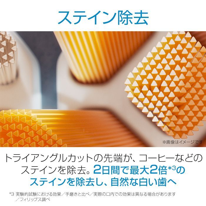 一本一本が三角形の形をしているトライアングルカットが、コーヒー、ワイン、タバコなどによる気になるステイン(着色汚れ)を除去。歯本来の自然な白さに導きます。