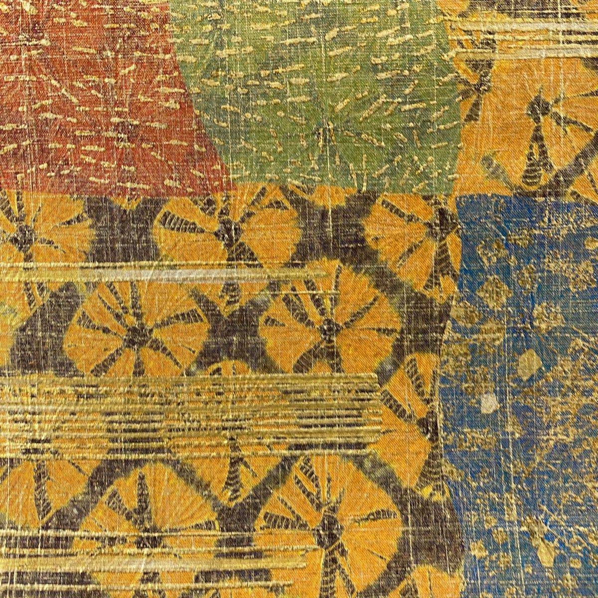 袋帯 落款 証紙 牛首紬地 霞 幾何学 金銀彩 絞り 黄土色 全通 正絹