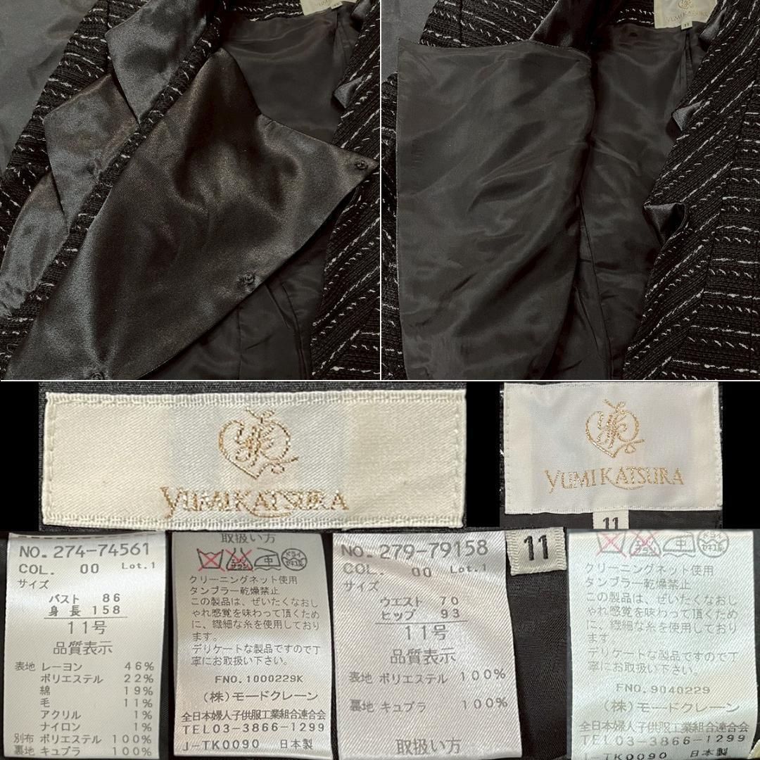 ブラックが基調のツイードのジャケット。銀糸の織模様と固い質感のフリルカラーがエレガントとシャープな印象も与えます。滑らかなサテンの胸当てを付ければ、よりシックな着こなしに、インナーを選んで雰囲気を変えた着回しもできます。ボトムは美しい光沢感のタフタのスカート。タックデザインの広がるフレアがドレッシーなシルエットをつくります。特別な日の1着にお勧めです。