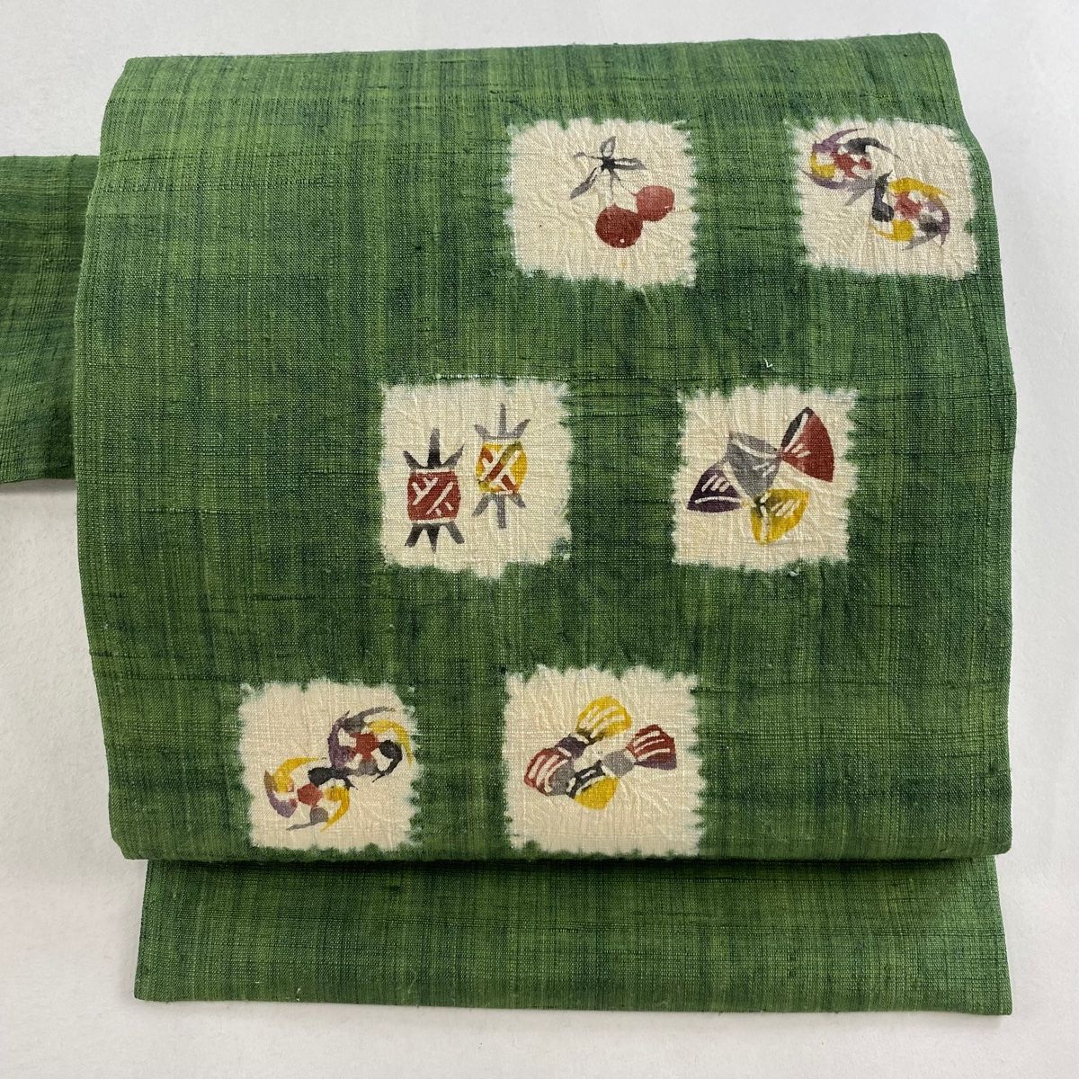 名古屋帯 秀品 紬地 さくらんぼ リボン 絞り 緑 正絹