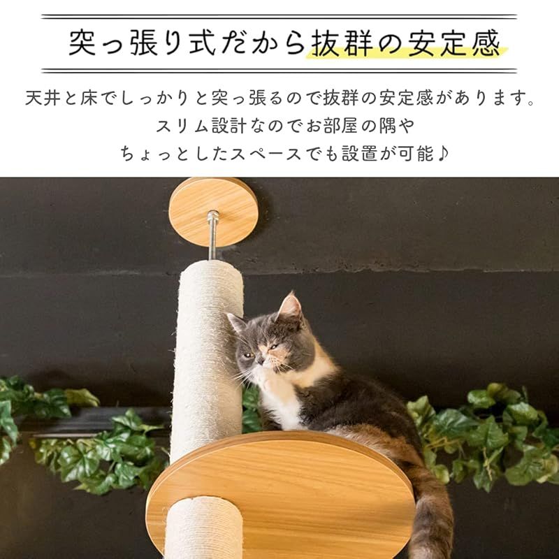突っ張り式キャットタワー/突っ張り式だから安定感があり、天井側の調節ネジを回すことで、簡単にタワーの高さを調整できます。