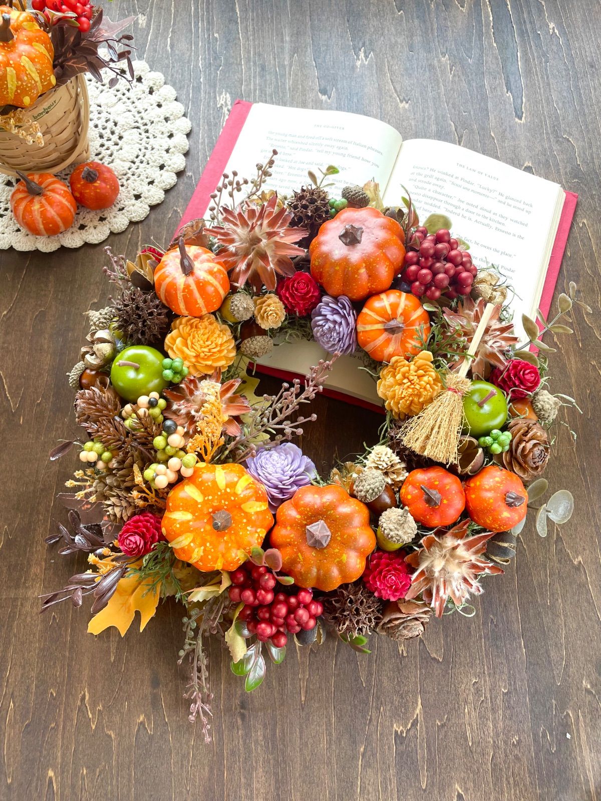 紅葉した葉っぱ、オレンジや赤のカボチャや木の実、温かさを感じるリースです。