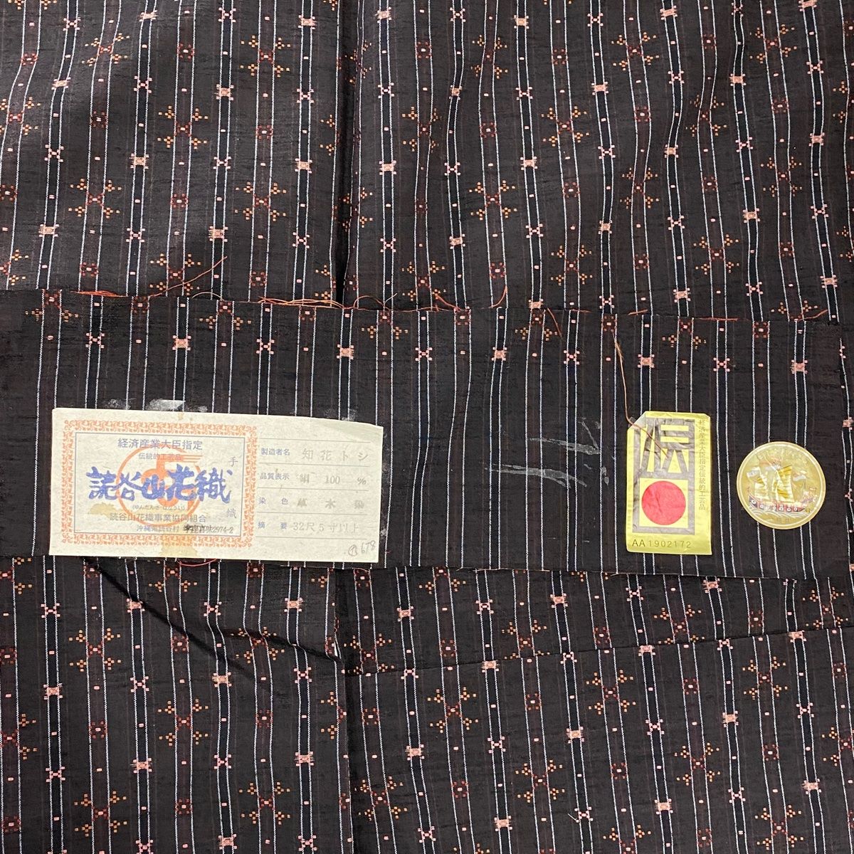 紬 身丈161 cm 裄丈61.5 S 袷 読谷山花織 草木染 やまと 証紙 縞 花 焦茶色 正絹