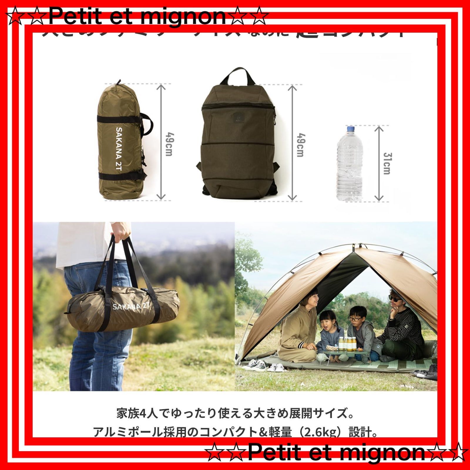 材質:メイン生地:75Dポリエステル(PUコーティング、UVカット加工、遮光コーティング) フロア生地:150Dポリエステル(PUコーティング)、ポール:アルミ合金