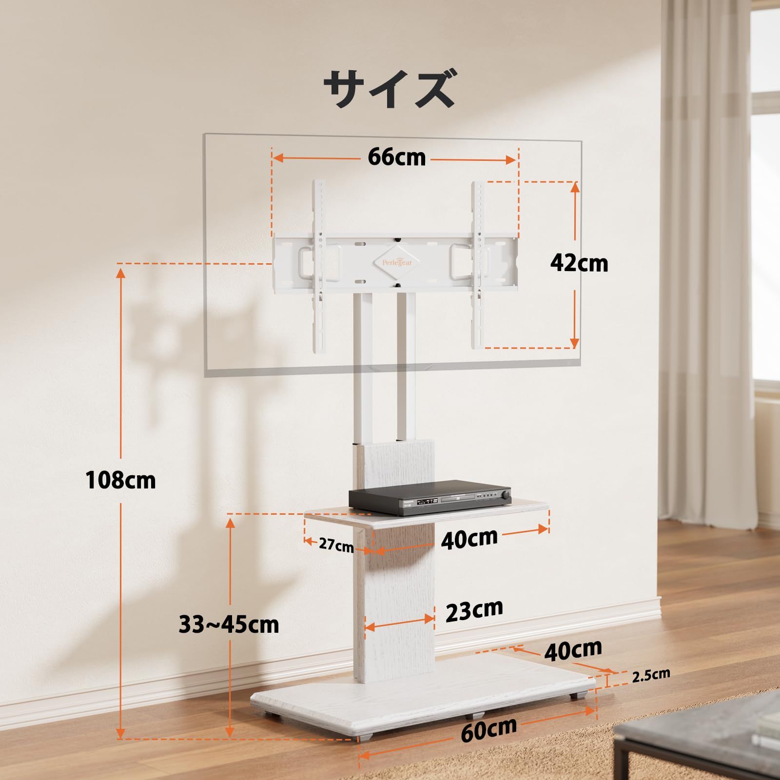 【12段目高さ調節・左右20度首振り】Perlegear 壁掛けtvスタンドは、TVブラケットの取付高さが3段階で、支柱の取付高さが4段階で、合計12段階の高さ調整が可能です。取り付け部中心から台座までの高さを93cmから108cmまで調整できます。テレビの端を軽く振るだけで、左右に20度首を振ることができ、角度を簡単に変えられて便利です。高さ調節・左右首振りが可能で、視野角が広くなり、部屋のさまざまな場所からテレビを観られ、快適に視聴できます。また、木製棚の取付高さが4段階で、台座までの高さを33cmから45cmまで調整できます。