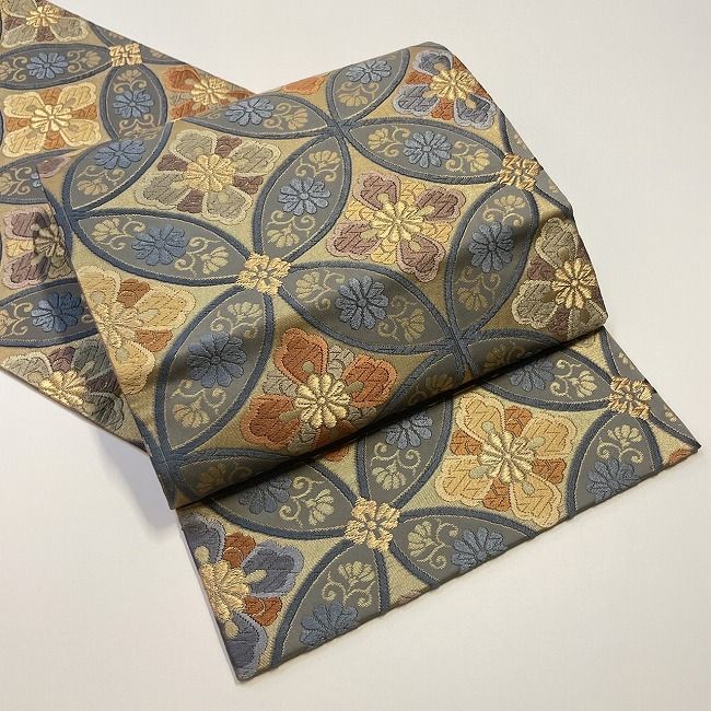 灰青色地に菱七宝のデザインが入った綺麗な袋帯です。
