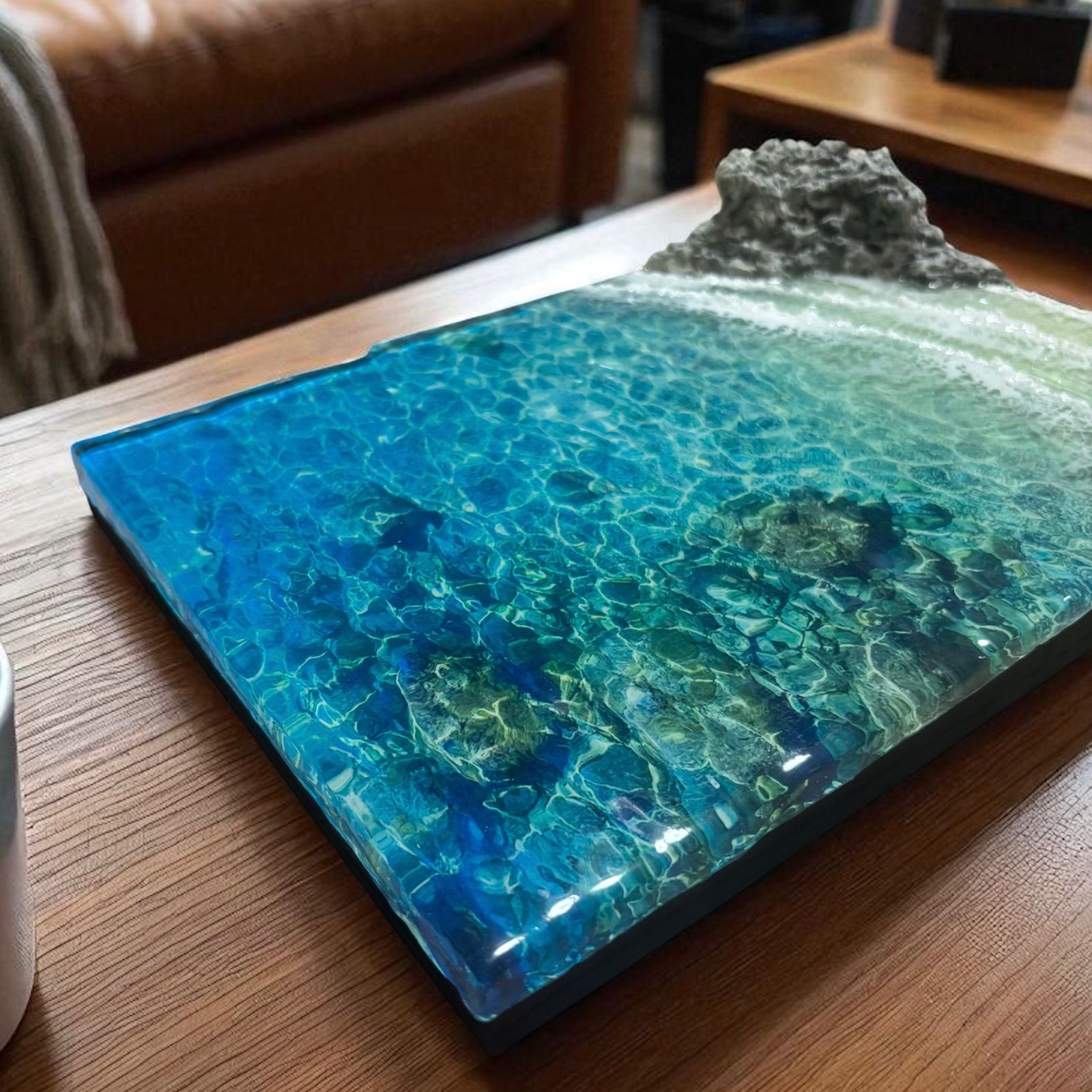 レジンで水面のゆらめきを表現し光の当たり方や見る角度によって海の表情が変わります。またレジンを混ぜ込み気泡も入れ水感を表現しています。