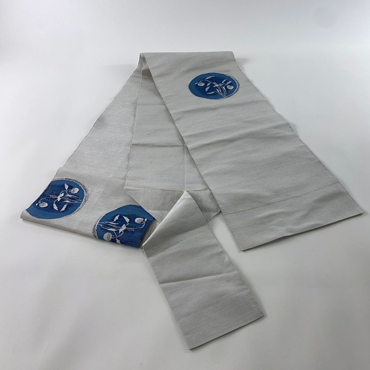 名古屋帯 秀品 八寸名古屋帯 松葉仕立て 丸紋 草花 灰色 正絹