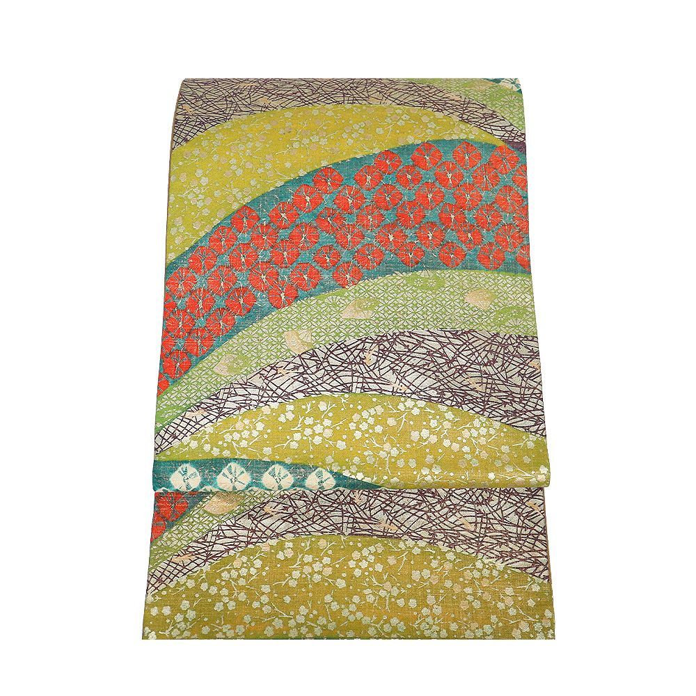 石川県指定無形文化財 手織り 牛首紬 お洒落訪問着用 袋帯 正絹 緑 赤紫 手蜘蛛絞り 檜扇 松葉 全通 ロングサイズ F 8393 み