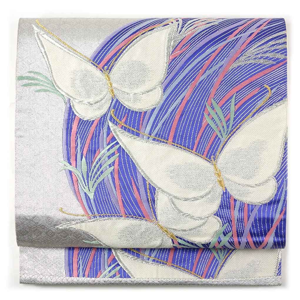 正絹の六通柄の袋帯です。銀地に蝶の意匠で訪問や振袖などフォーマル用途の着物に合わせてお使いいただけます。
