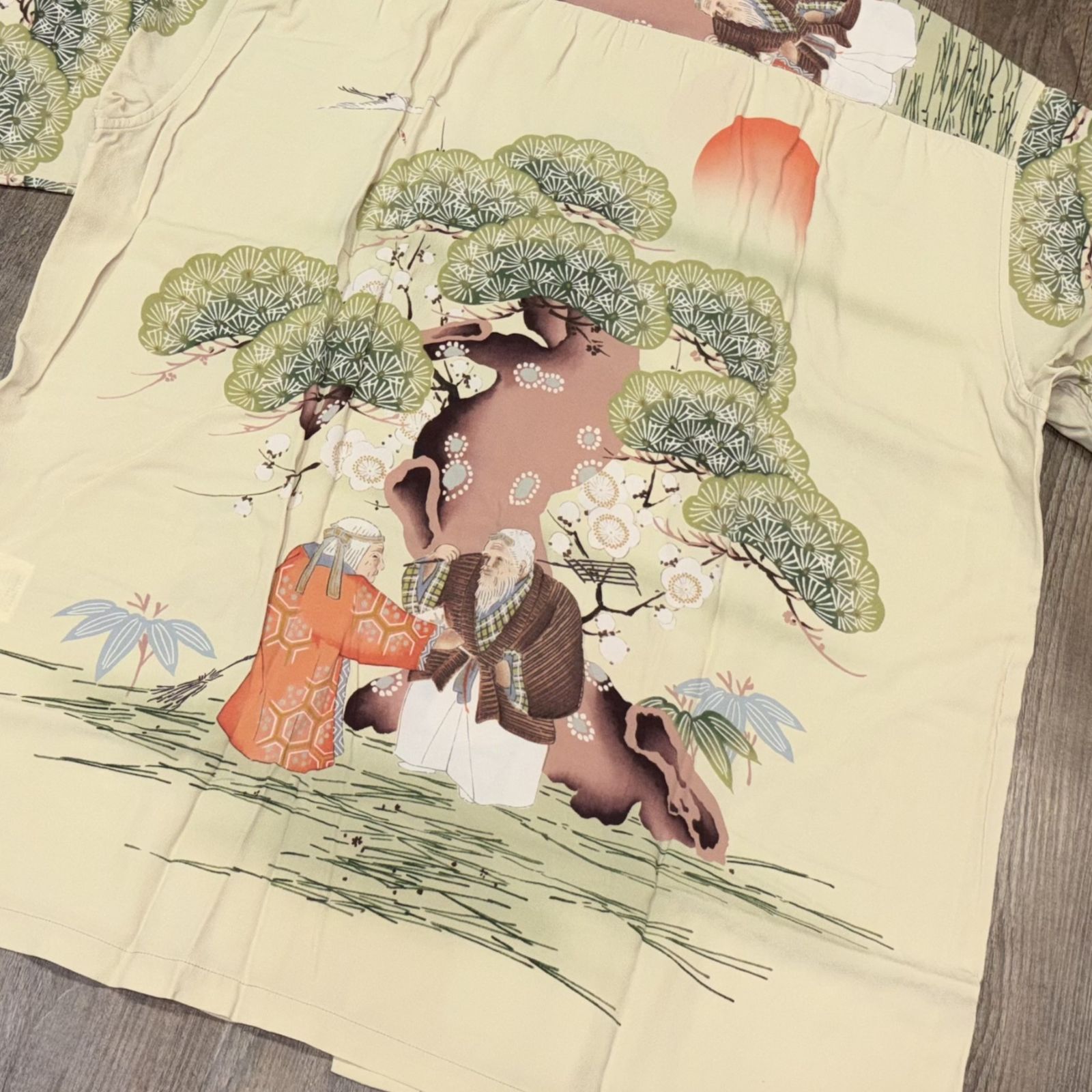 本作は、K・イソシマ商店のブランド「ハレ・アロハ」が1940年代後期に手掛けたもので、当時、日本の染工場でプリントされた生地を使いハワイで縫製された一枚。絵柄のモチーフは日本の伝統芸能である能の演目のひとつ「高砂(たかさご)」。福をかき集める熊手と邪気を払う箒(ほうき)を持った老夫婦、吉祥の象徴である松・竹・梅、鶴や朝日などが描かれた非常に縁起の良いデザインとなっている。