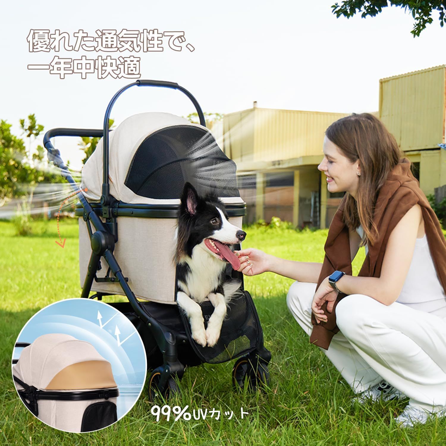 中型犬 ペットカート 30 kg耐荷重 自動折り畳み 大型ホイール 三面メッシュ 安定性抜群