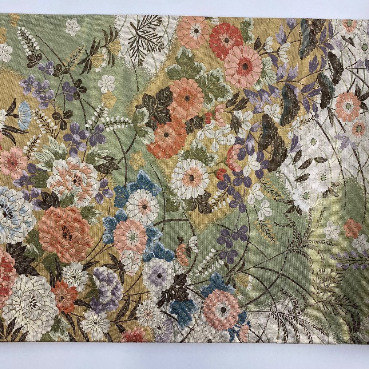袋帯 秀品 扇面 草花 箔 薄緑 六通 正絹