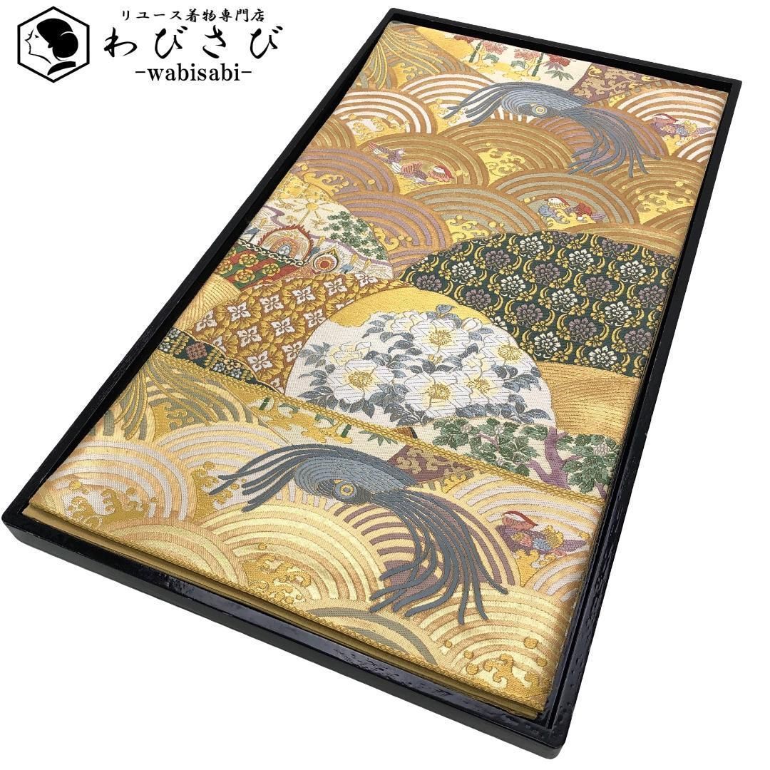 袋帯 唐織 花模様 青海波 鴛鴦 金色 金糸 O-5649
