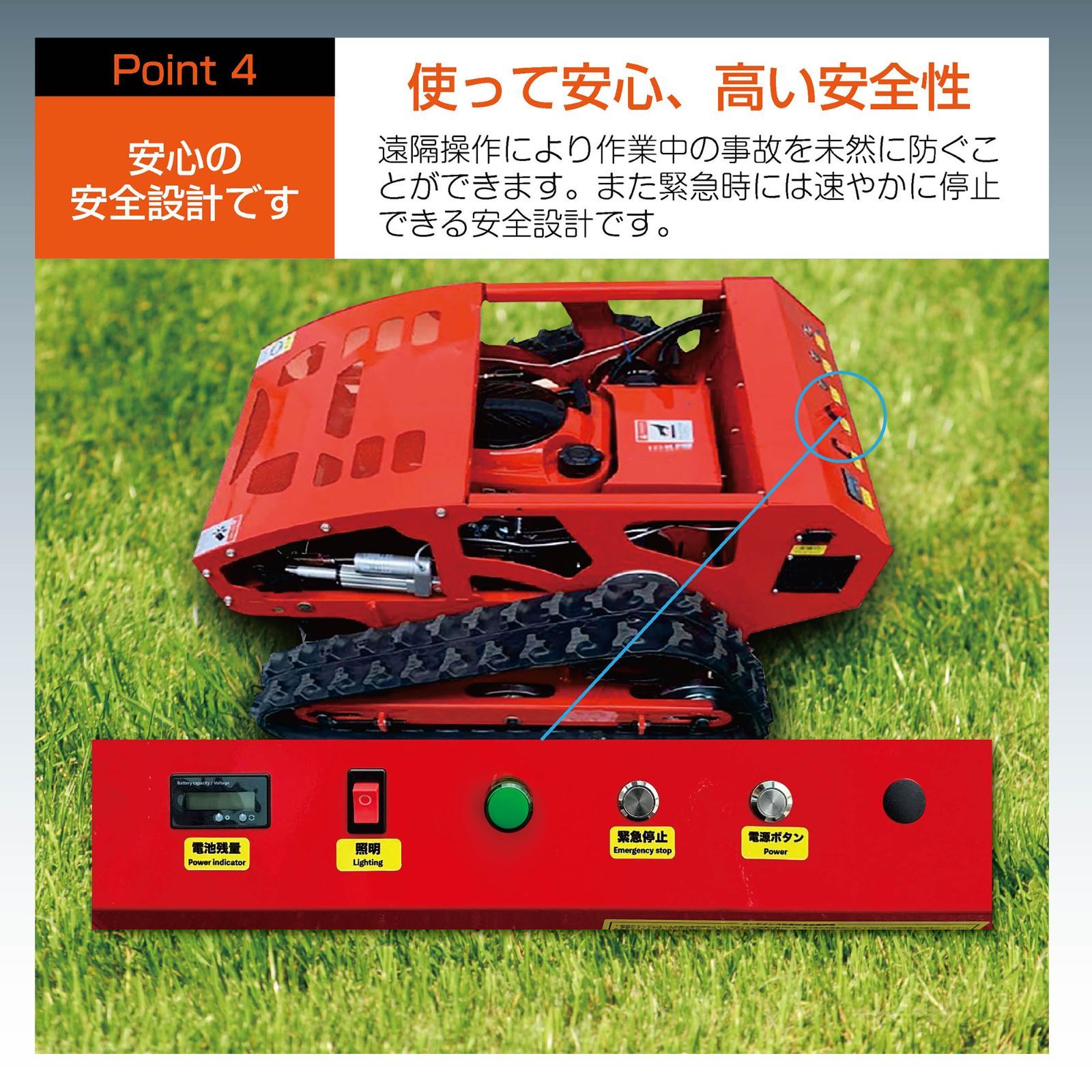■安全第一!事故の心配を最小限に 緊急停止機能を備えた遠隔操作により、作業中の事故や怪我のリスクを軽減。安心して作業に集中できます。