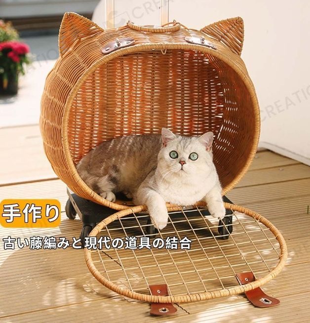 手作り籐かごペットキャリーカート猫かご小型犬ケージとカート猫小動物ラタン製取り外し PE籐