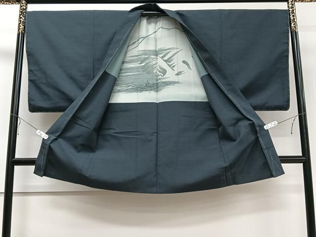 平和屋着物#男性 長羽織 お召地 紋付き 藍鉄色 正絹 id