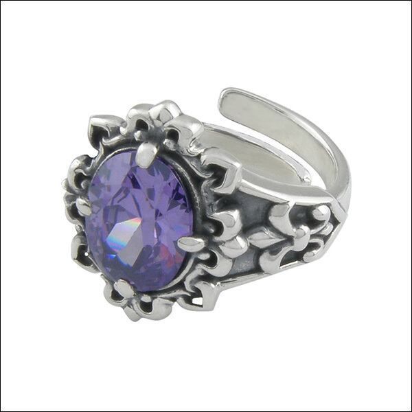 A ring of striking presence, centered on an oval-cut cubic zirconia that radiates a mysterious violet glow. Encased in an ornate setting inspired by the fleur-de-lis—a timeless symbol of gothic elegance—the stone is framed by flowing motifs that extend seamlessly along the band. The result is a design that balances classical grandeur with a distinctly modern edge.