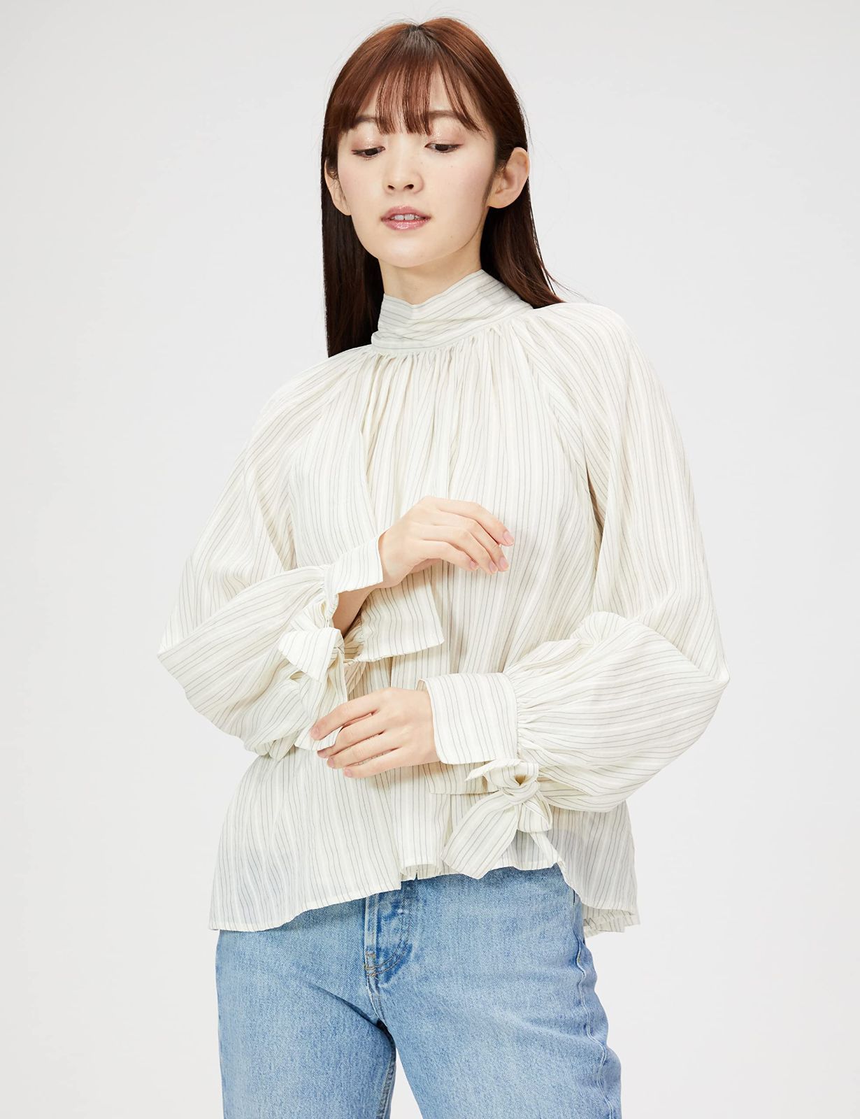 美しく立ち上がるスタンドカラーと袖口のリボンがほんのりクラシカルな要素をプラスし、首元まわりのギャザーや袖のラグランスリーブ切り替えでフォルムを上品に演出します。 トレンドライクな袖のボリューム感がぐっとおしゃれに着こなせるポイントで、ふんわり軽やかな風合いで柔らかな表情を作り出し、裾はインにもアウトにも可能なため、カジュアルから綺麗めまで幅広く合わせられるアイテムです。