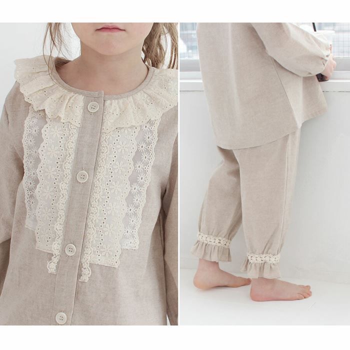 BEIGE L トワルパジャマセット パジャマ 前開き 女の子 キッズ セットアップ 上下セット 長袖 上下 長ズボン レース フリル 綿100 ナチュラル ベージュ おしゃれ かわいい オシャレ ルームウェア