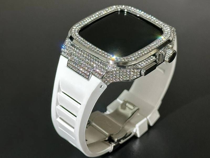 ホワイト-シルバー アップルウォッチバンド ラバーベルト 316 Lステンレスカバー 重厚メタルケース ダイヤ キラキラ クリスタル 44 mm 45 46 メンズ レディース Series 4〜11 SE 2 3