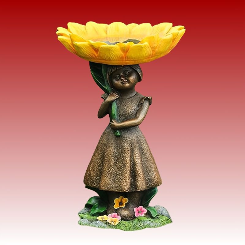大きなヒマワリを抱えた可愛い少女のバードフィーダーは、小鳥や野鳥のための給餌器として、ガーデンオブジェやインテリアとしても魅力的なアイテムです!