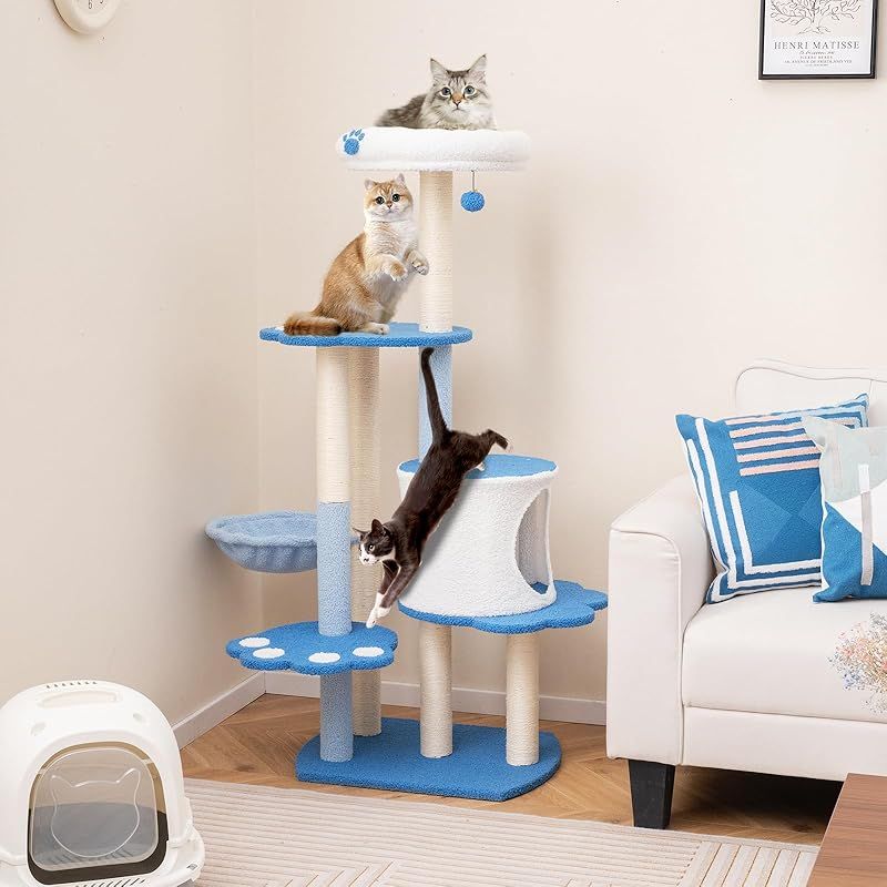 ? 複数の休憩ポイント トップの休憩スペース:厚手のクッションで、ネコちゃんが快適に寝始める場所を提供。 ゆったりしたハンモック:ネコちゃんがゆらゆらと揺れながら、のんびりと過ごせる場所。 隠れ家のようなキャットハウス:プライベートな空間で、ネコちゃんが安心して昼寝できる場所。 ? 複数の遊び場で自由に探索 6段の構造:2つの広いプラットフォームを備え、ネコちゃんが登ったり、運動したり、遊んだりするのに十分なスペースを提供。 インタラクティブなおもちゃ:ベルつきのフワフワなぶら下がりボールが付いており、ネコちゃんの好奇心を刺激します。 ? 天然のジュート爪とぎ柱 6つの爪とぎ柱:ネコちゃんの爪とぎや伸びをしたい欲求を満たし、家具を傷つけないで済みます。 天然サイザル麻素材:安全で信頼性が高く、健康的な爪とぎ習慣を育てます。 ? 暖かく快適な体験 超ソフトなテディファブリック:ネコちゃんが安心して休息できる、柔らかく温かい環境を提供。 お手入れ簡単:生地は毛玉になりにくく、毛が抜けないため、掃除もしやすく、いつも清潔に保てます。 ? エレガントでスタイリッシュなデザイン 爽やかなブルー&ホワイトのカラー:かわいい猫の爪の柄がアクセントとなり、インテリアに洗練された雰囲気を加えます。 生活空間にぴったり溶け込む:美しいデザインが猫タワーを家中の素敵なアクセントにします。