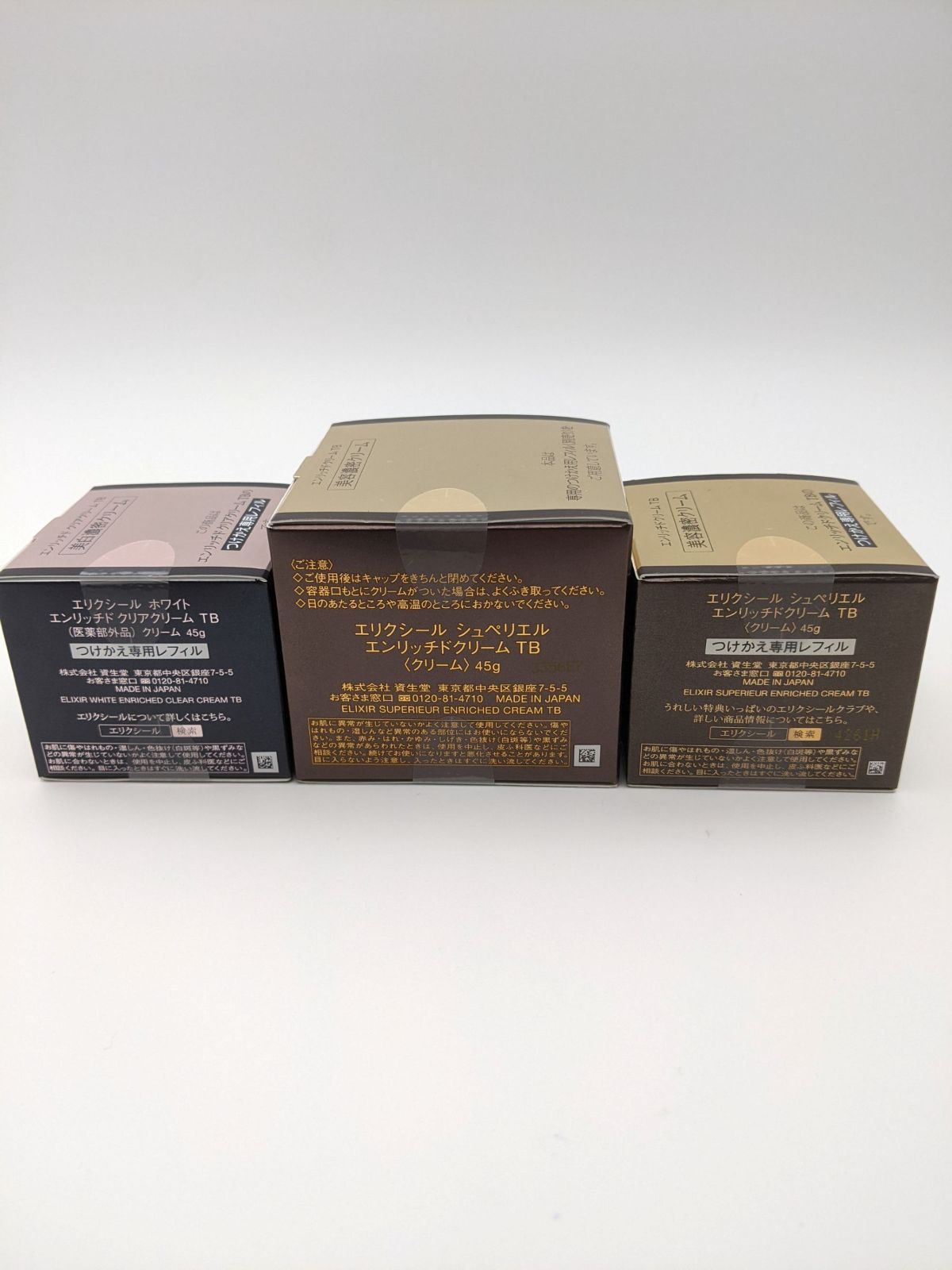 資生堂のエリクシールシリーズのエンリッチドクリーム3種セットです。すべて新品未開封で、レフィル(詰め替え用)になります。
