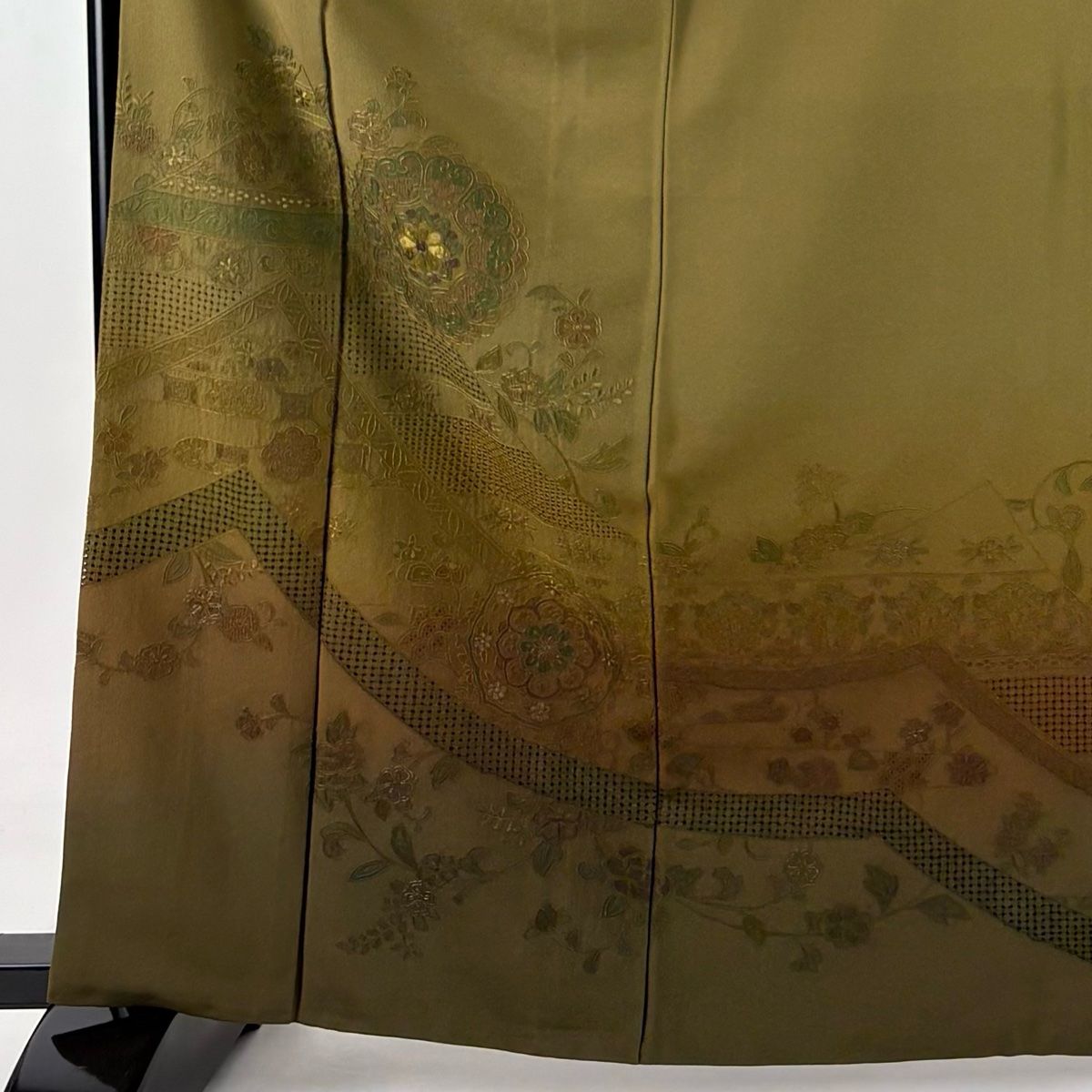 訪問着 身丈164 cm 裄丈66 M 袷 華文 花唐草 銀糸 刺繍 茶緑色 正絹 秀品 一つ紋