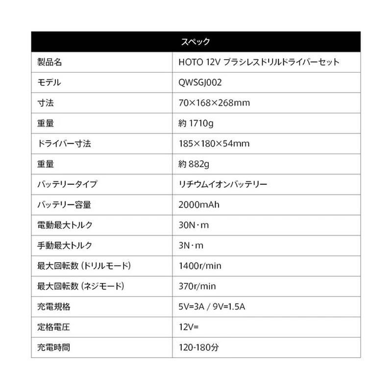 HOTO 12 V ブラシレスドリル ドライバーセット 電動 工具セット Type C充電 金属用 木材用 マグネット式 10本S 2合金鋼ビット