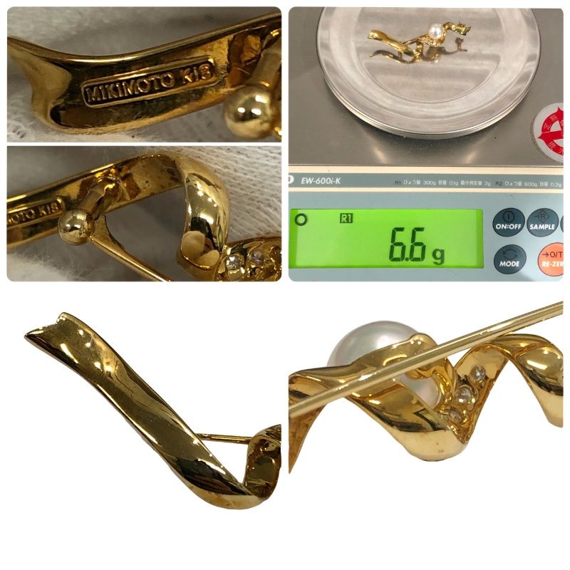ミキモト リボンモチーフ ブローチ K 18刻印 真珠 珠径約8.4 mm メレダイヤモンド パール