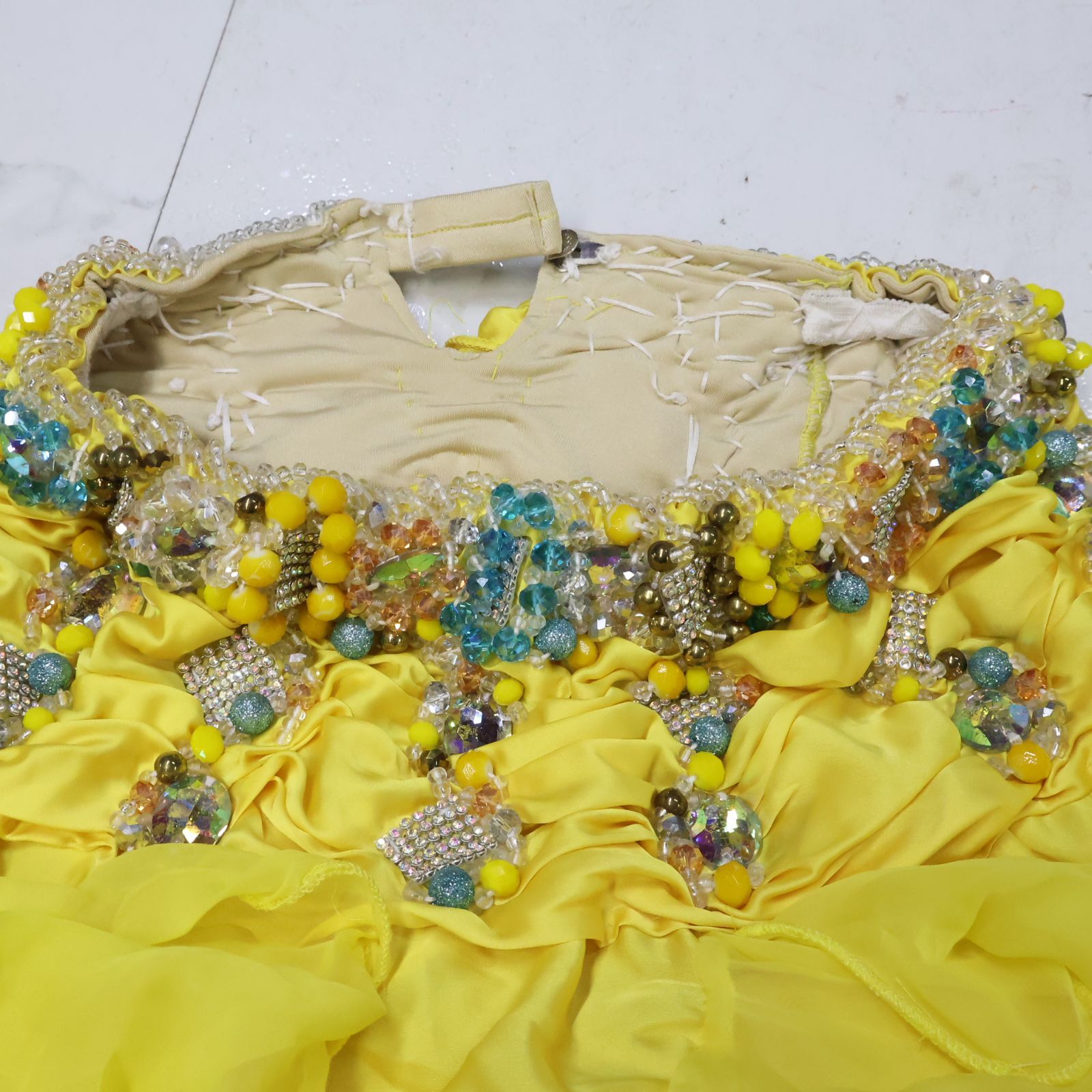 ベリーダンス用 オリエンタル衣装 イエロー ラインストーン ビーズ 豪華 ブラトップ スカートセット フリル レース 鮮やか