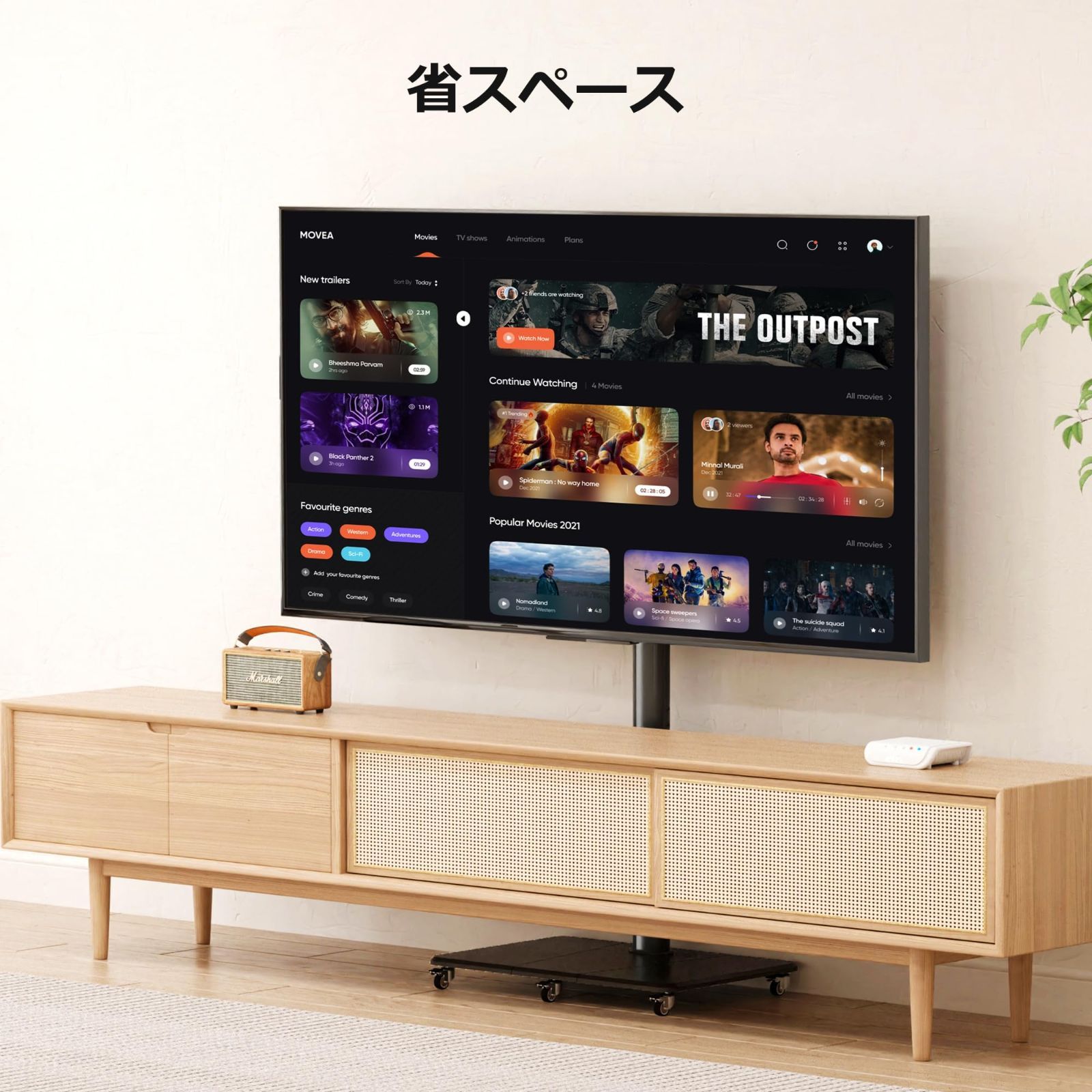 【省スペース】壁寄せスタンドタイプで壁掛けのように、すっきりとテレビを配置ができます。デッドスペースを減らしてお部屋を有効活用でき、足元も広くなります。キャスター付きで自由に移動できるため、使いやすさが一層向上します。お部屋の角にも自由に配置できるのが魅力です。40×60cmの木製ベースの上にもスピーカーを置くことができ、スペースを有効活用できます。