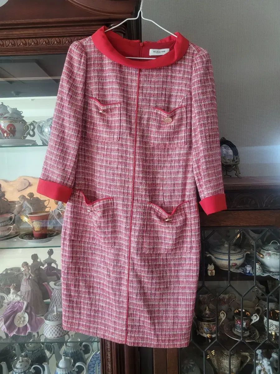 これは66サイズのモジョエスピンドレスです。ネックラインのリボンディテールと袖のパールボタンがハイライトです。フォーマルな場面にも最適です。ご不明な点がなければ、すぐに安心してお支払いいただけます!