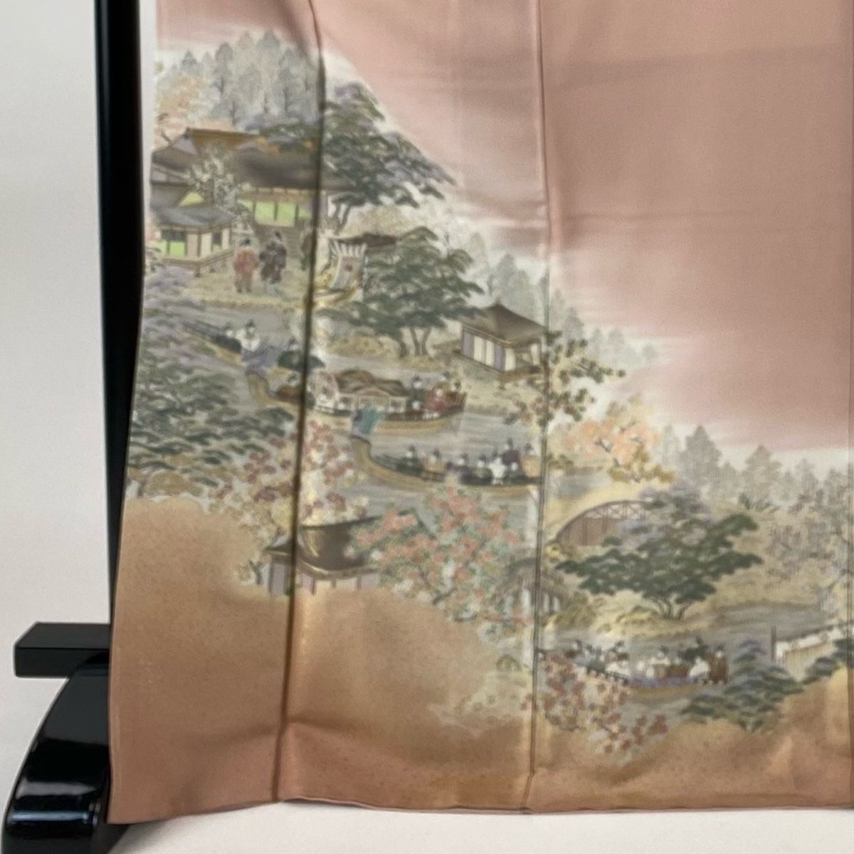 色留袖 身丈171 cm 裄丈68 L 袷 落款 神泉苑御遊図 舟 金銀糸 箔 ピンク 正絹 秀品 一つ紋