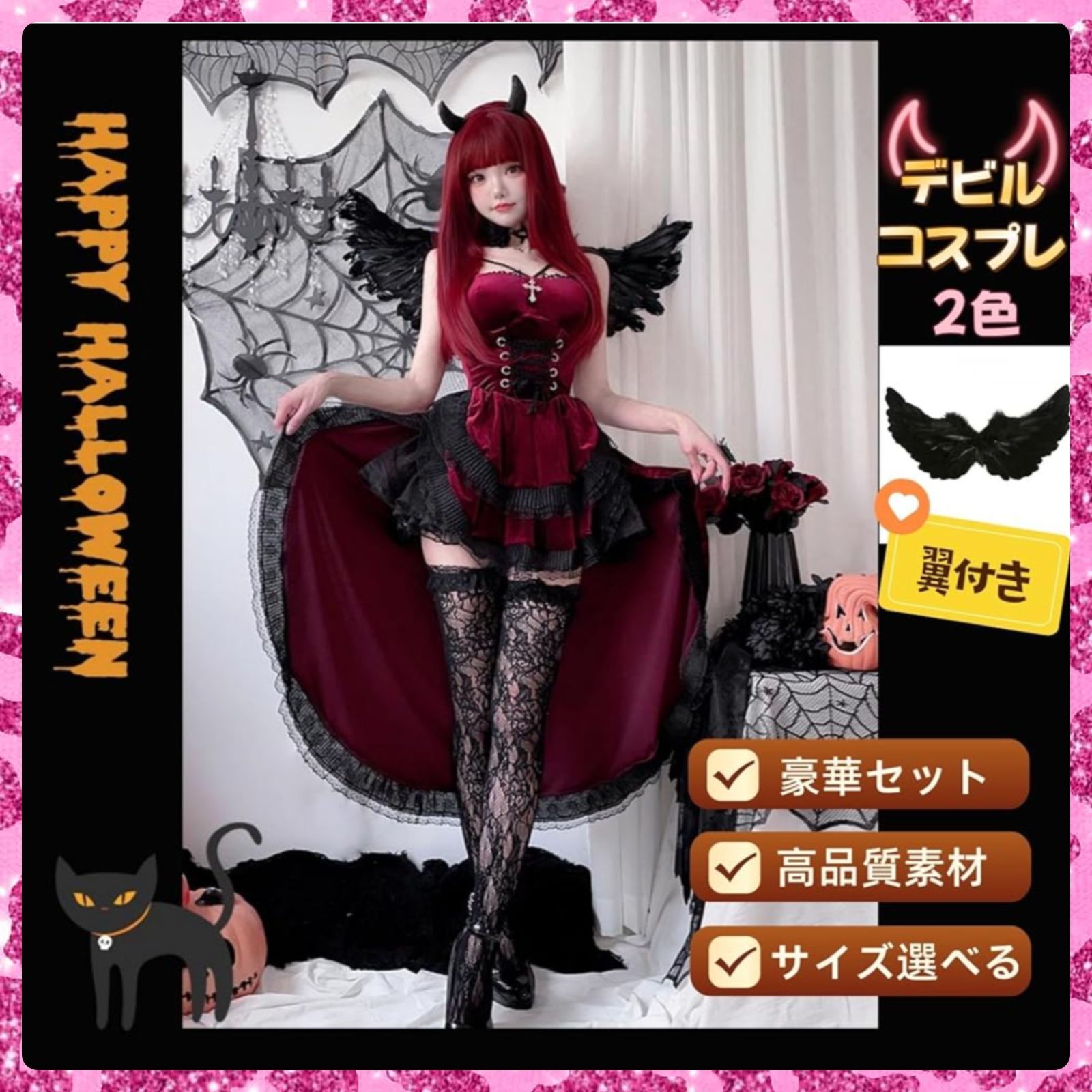 魔女デビルコスプレ 小悪魔 セクシー 6点セット 羽 パニエ 黒 赤 悪魔 吸血鬼 ハロウィン 衣装 大人 レディース 可愛い 大きいサイズ 角 ワンピース エルフの耳 ニーソックス付き イベント 仮装パーティー