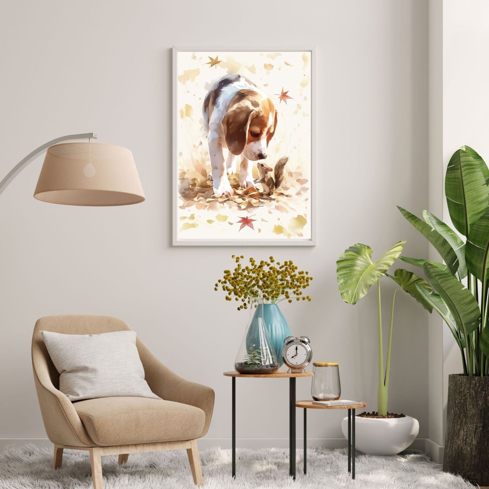 紅葉の秋に栗鼠(リス)と戯れるビーグル犬の子犬の姿が可愛すぎるアートポスター作品です。