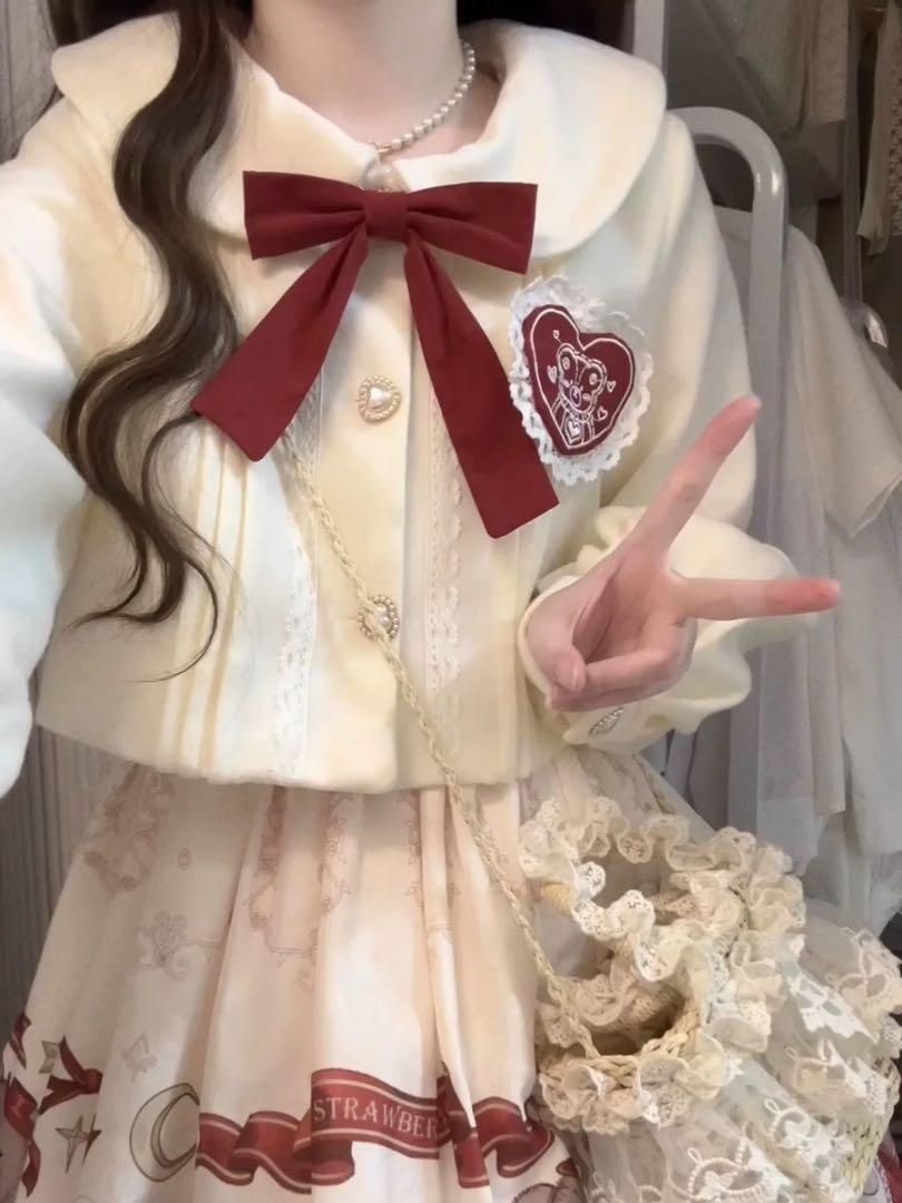 秋冬の女子会やお出かけにぴったりなロリータワンピース2点セット!ひざ丈で上着付き、イチゴ柄と愛らしいクマちゃんがあなたを包みます。普段着にもおすすめです♪