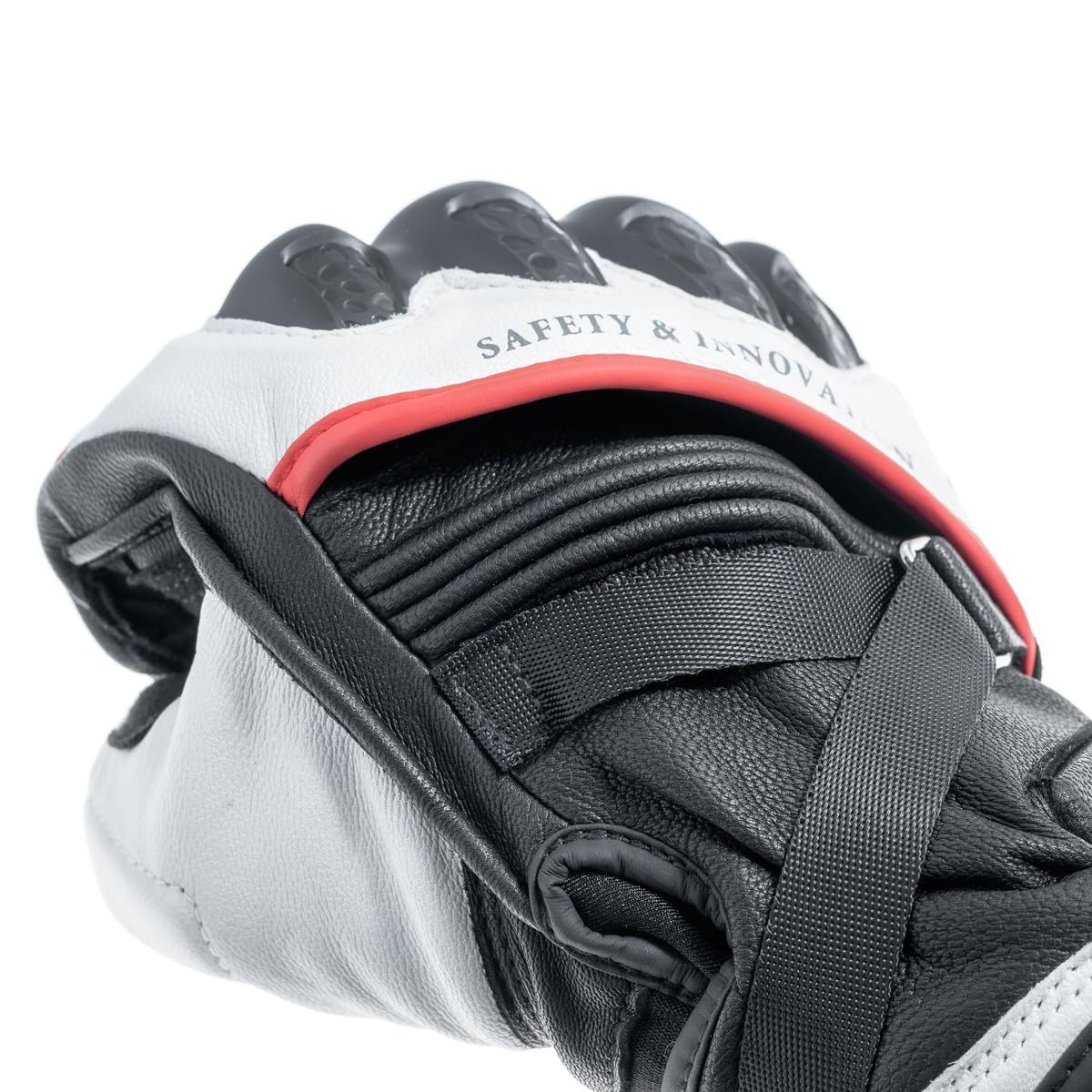 外縫い構造で抜群の操作性を実現した防風仕様ウインターグローブ。手首から手の甲を走る補助ベルトにより、コンディションに応じたフィット感の調整が可能。ナックルには独自に開発したプラスチックガードを、掌にはカーボンシェルを採用。