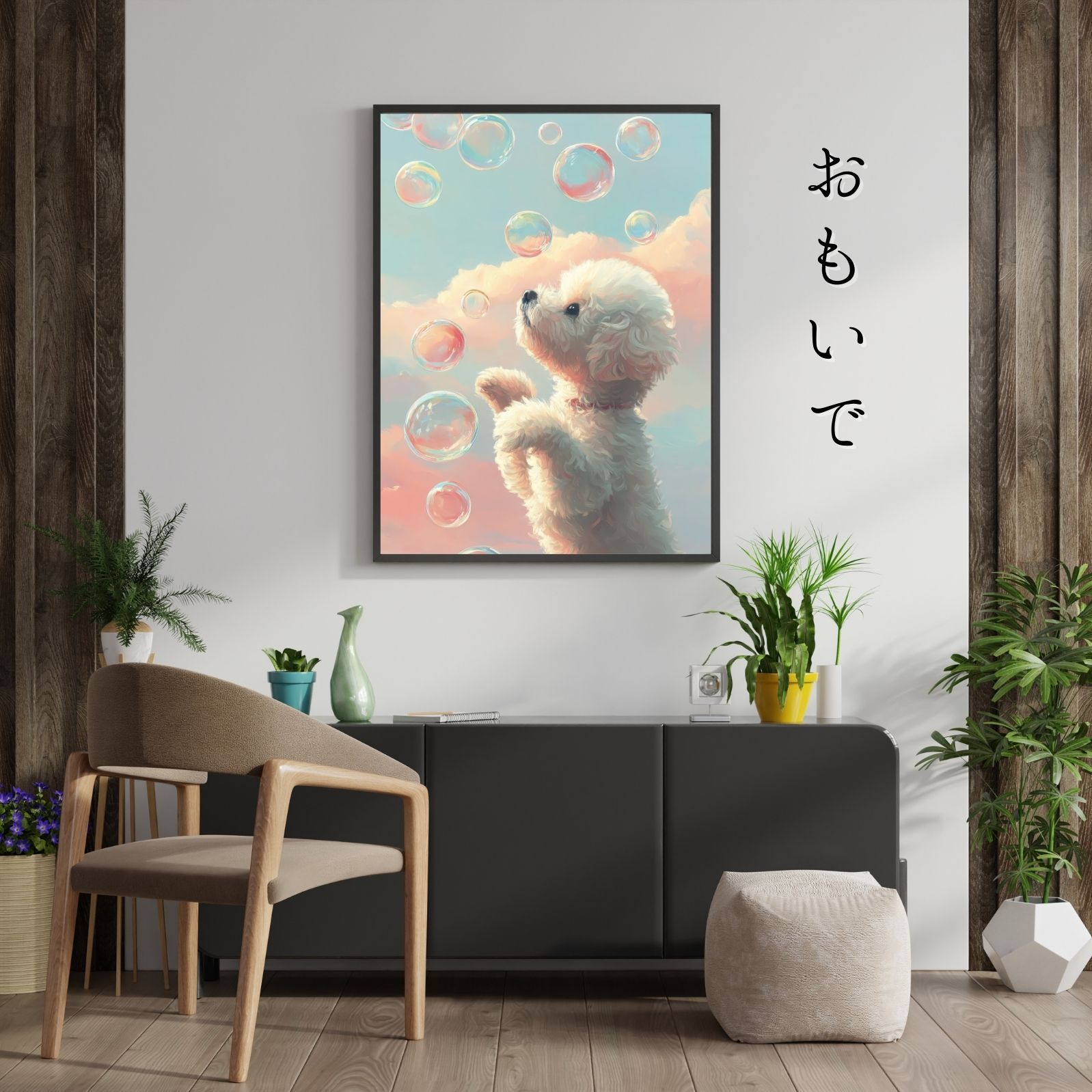 かわいいビションフリーゼ犬が、空に舞うシャボン玉を見つめる愛らしい瞬間を切り取ったアートポスターです。