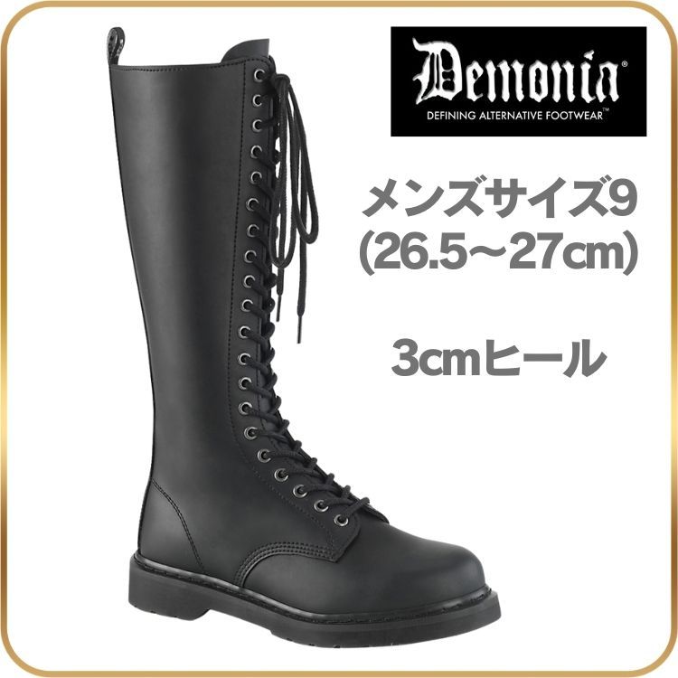 26.5 27 cm demonia デモニア ロングブーツ フラットヒール 3 ヒール 黒 ブラック つや消し 編み上げ レースアップ ジッパー コンバットブーツ ロック パンク ゴシック 原宿系 靴 ユニセックス BOLT-400 BOLT 400 BVL